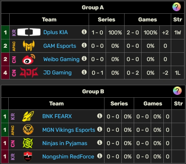Mientras que en el grupo B están BNK FEARX, MGN Vikings Esports, Ninjas in Pyjamas y Nongshim RedForce.