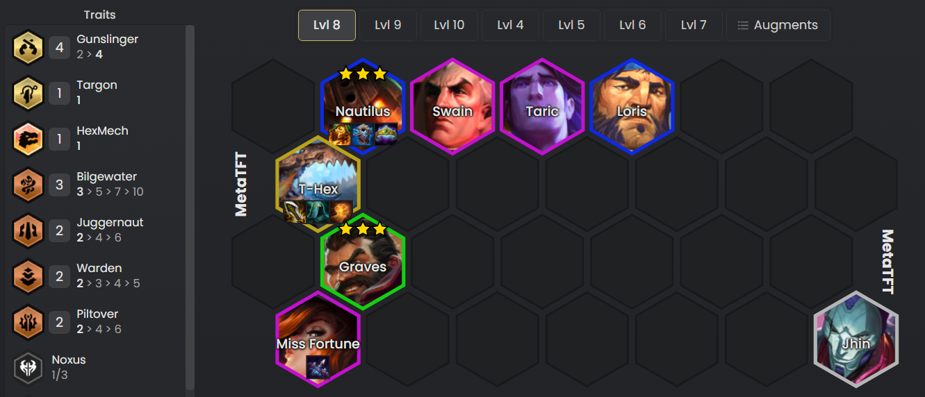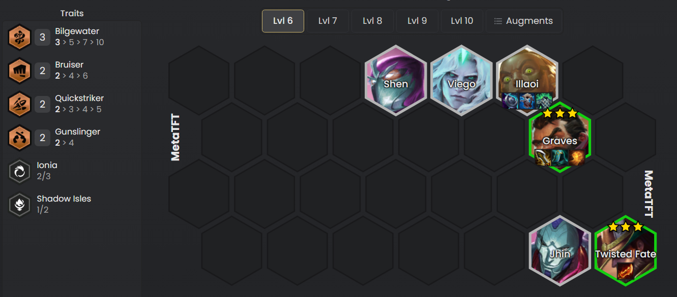 - Una composición de reroll clásica de Bilgewater en la que buscaremos a Twisted Fate y Graves de 3 estrellas a nivel 6.