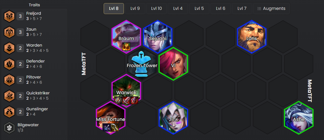 - La clave es llevar 3 Freljord y 3 Zaun, así como una mezcla de sinergias para potenciar a todas las unidades.