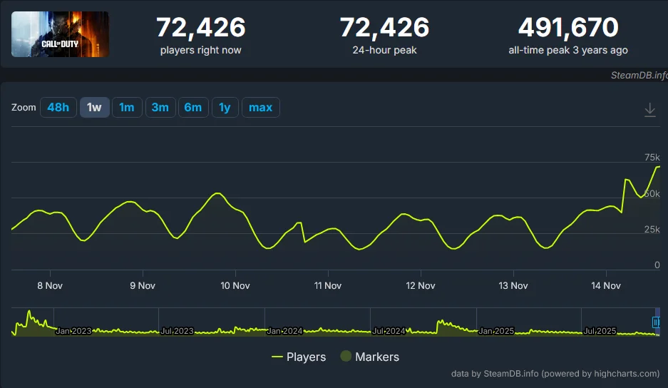 En cuanto a la acogida del juego, si nos guiamos por Steam, parece que no está teniendo el mismo impacto que Battlefield 6. En SteamDB, podemos ver que el pico de jugadores en las últimas 24 horas (en el momento de escribir este artículo) es de 72,426. Sin embargo, la página de Call of Duty en Steam es la misma para los juegos que han lanzado en los últimos años, así que no es posible sacar conclusiones…
